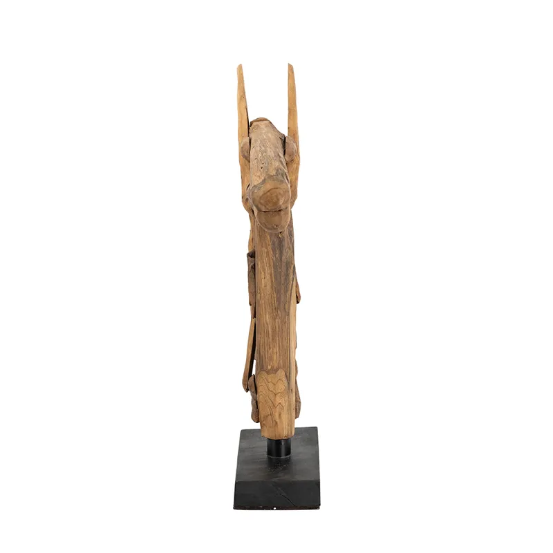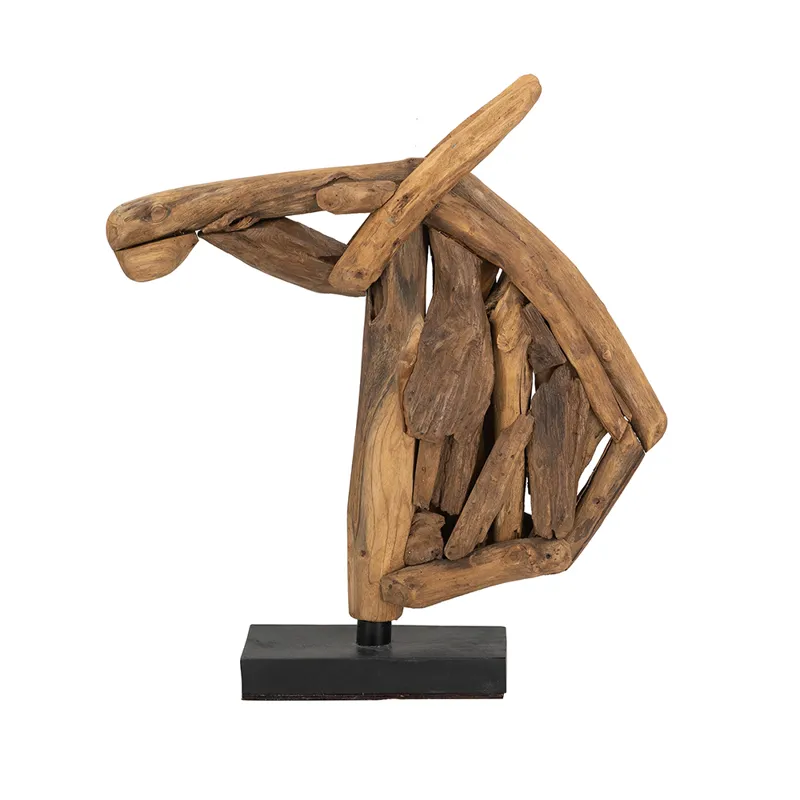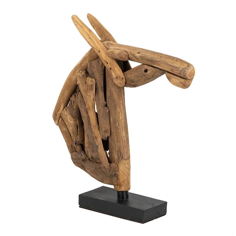 Capturing the distinctive beauty of abstract art, this sculpture showcases a masterfully carved horse head, crafted from warm brown teak wood. Set atop a sturdy black base, it is sure to make an impression on any console, dresser, or tabletop.
