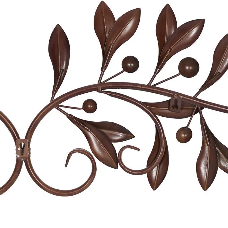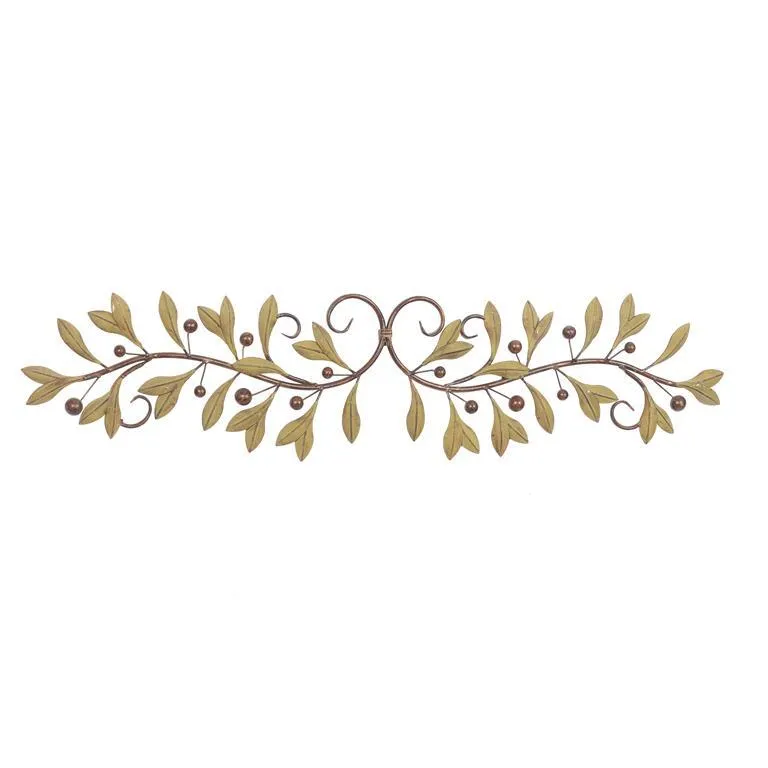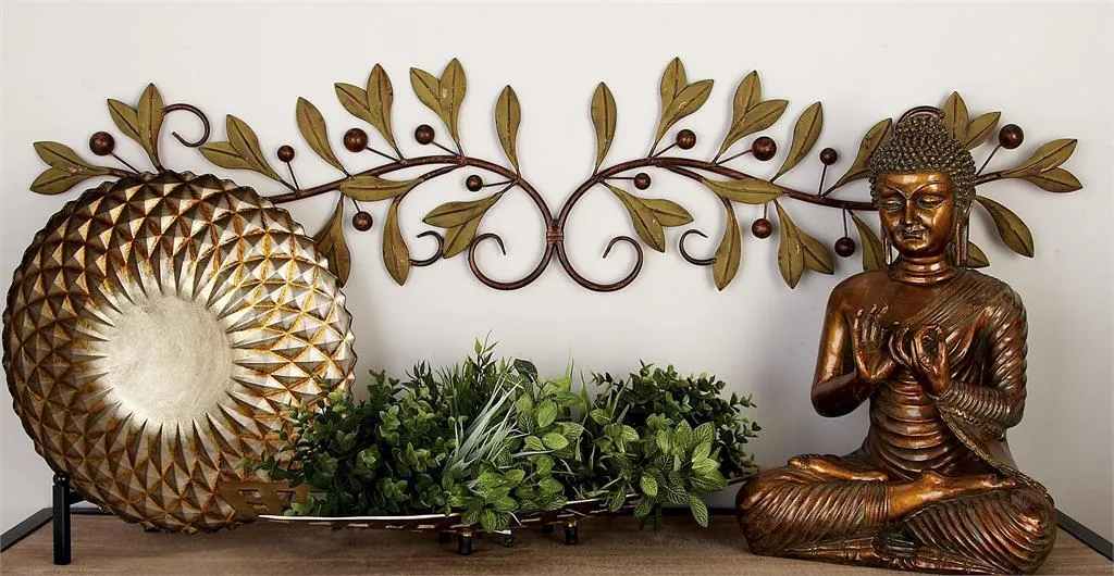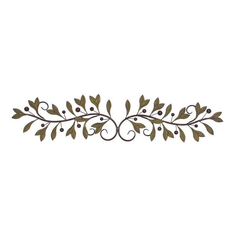 Designed with the essence of timeless sophistication, where rich old-world textures and warm hues come together for a refined classic taste of understated luxury Leaves wall decor with scrollwork frame is made of a solid iron A floral design with shades of matte green and brown finish Features leaves with berries vine carvings in textured green and brown finish The wall decor measures 48L x 1W x 11H inches, and weighs 3.15 lbs