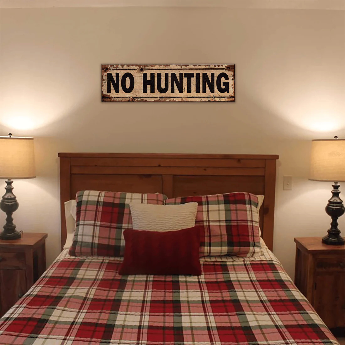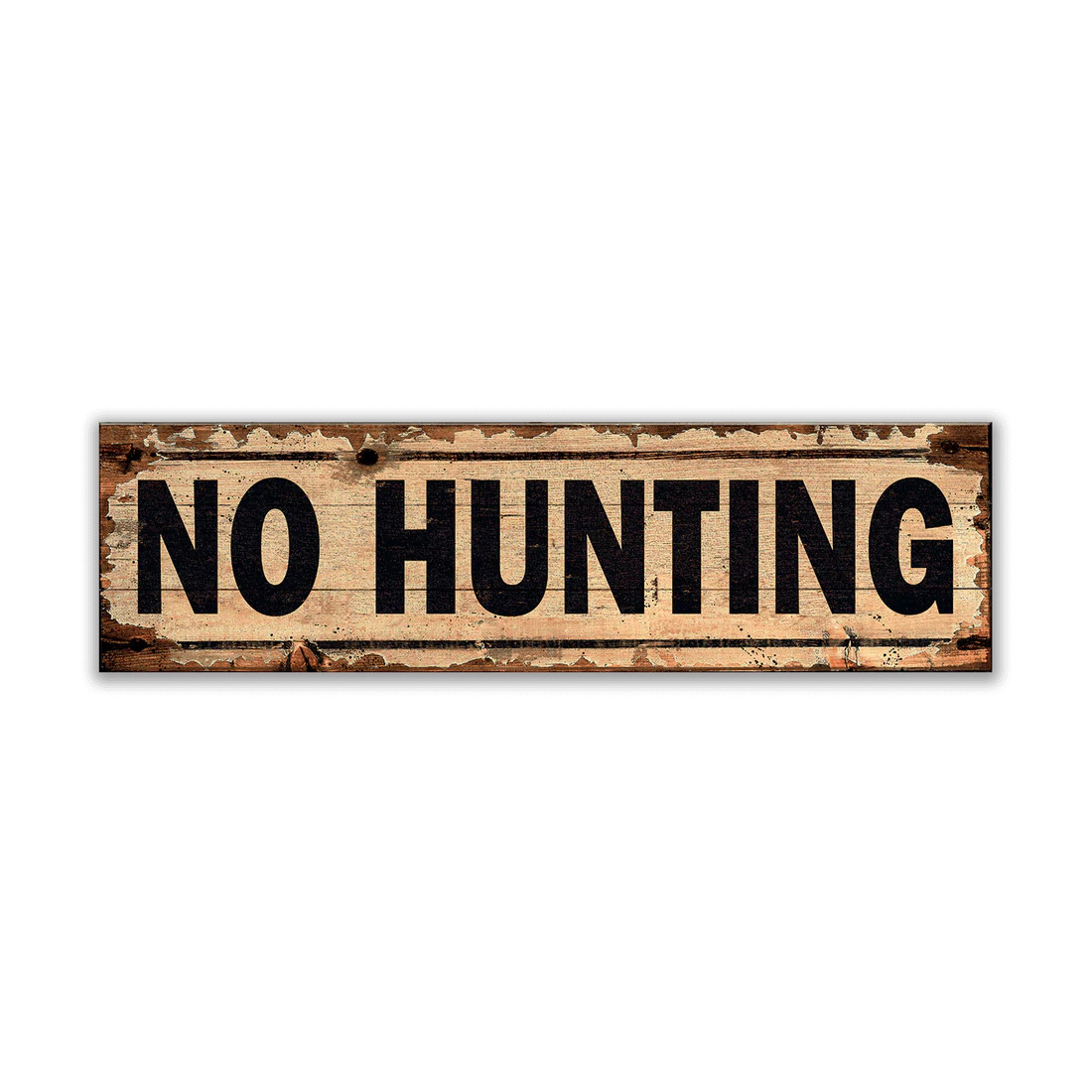 This No Hunting sign, with its rustic, weathered design and bold black lettering, offers a touch of humor for outdoor enthusiasts. Perfect for decorating cabins, lodges, or nature-inspired spaces, this sign adds a playful, whimsical element to your decor. While it could be used functionally, its vintage charm makes it an ideal accent piece for those who enjoy lighthearted, rustic style. A great way to add personality to any outdoor or indoor setting.