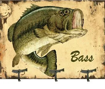 Bass Coat Rack - Rustic vintage sign printed directly to a distressed wood panel that has knots and other imperfections. We end up printing right over these imperfections which gives each sign the look and feel of a real vintage sign. No two are the same! Often people ask us "Are these originals?" All of our signs can be customized making each vintage sign personal and original. Each designed in the style and look of a historical period using different font styles, colors, and vintage layouts.