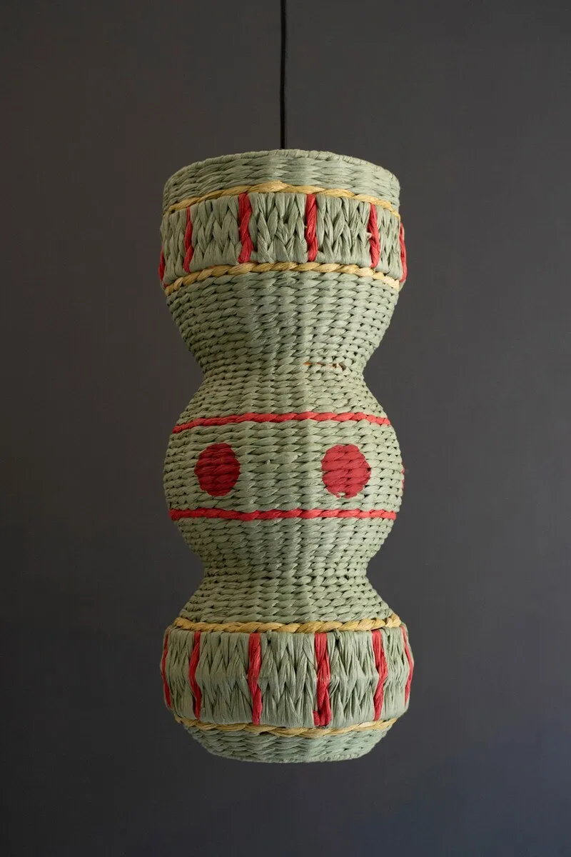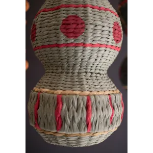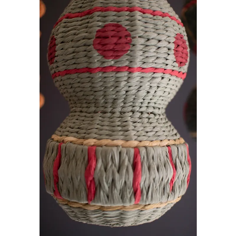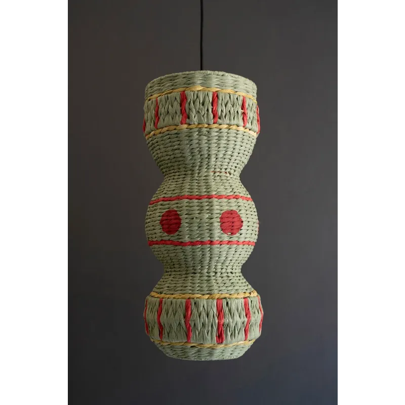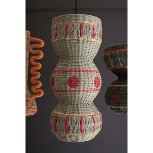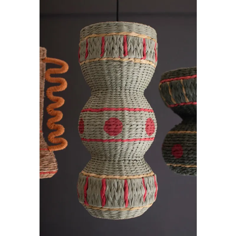 Triple the layers with this recycled paper rope and iron pendant light. The body is greenish-gray with red and gold accents. Highlight an area with one or two or mix and match with other styles.