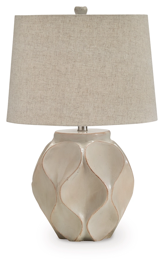 This table lamp takes a simply stylish approach to everyday illumination. Its glossy cream finish and neutral shade seamlessly pair with a variety of casual aesthetics. Cool curves give it an artisanal feel, instantly adding sculptural style to an accent table or desk.