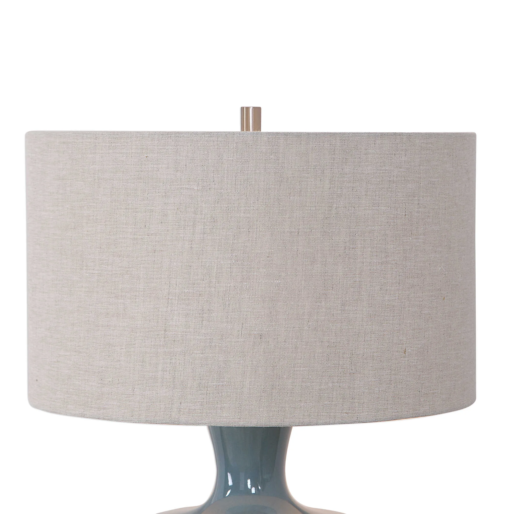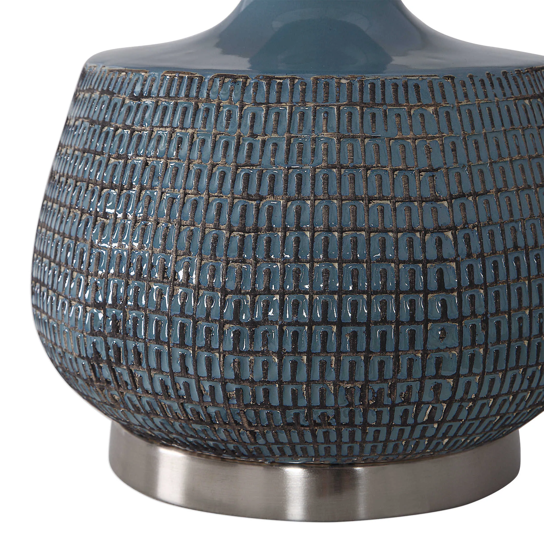 Add a touch of tribal flair to any room with this embossed ceramic table lamp that's finished in a blue glaze with rust bronze distressing that highlight the decorative detailing, paired with brushed nickel plated accents. The round hardback drum shade is a light beige linen fabric with natural slubbing.