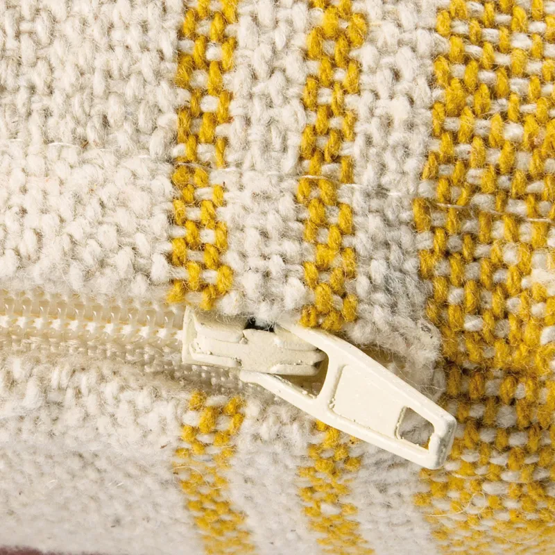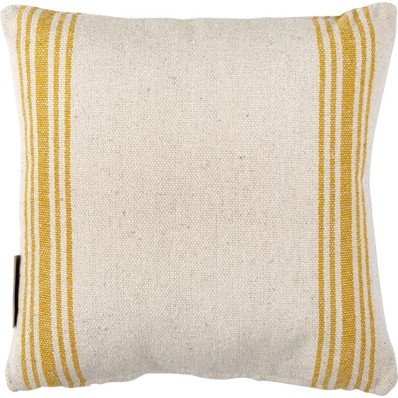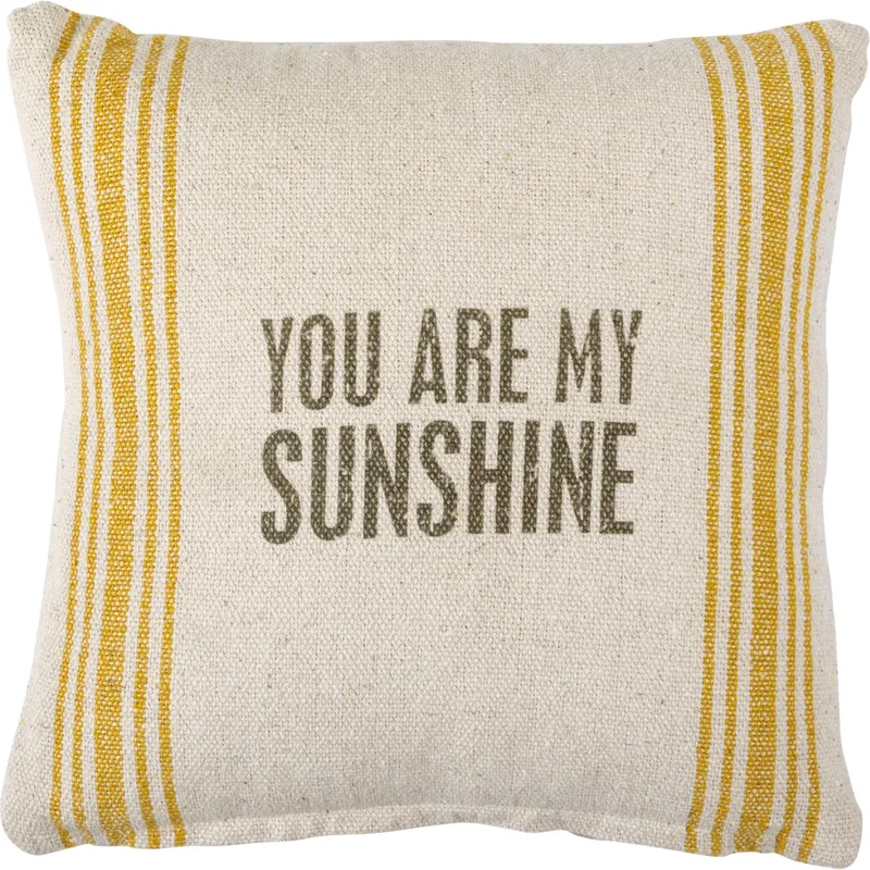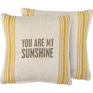 A cotton pillow from our Word Art Linens Collection featuring a distressed "You Are My Sunshine" sentiment and gold stripe designs. Polyester filling. You Are My Sunshine pillow is shipped vacuum-sealed for protection and storage.