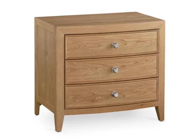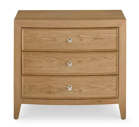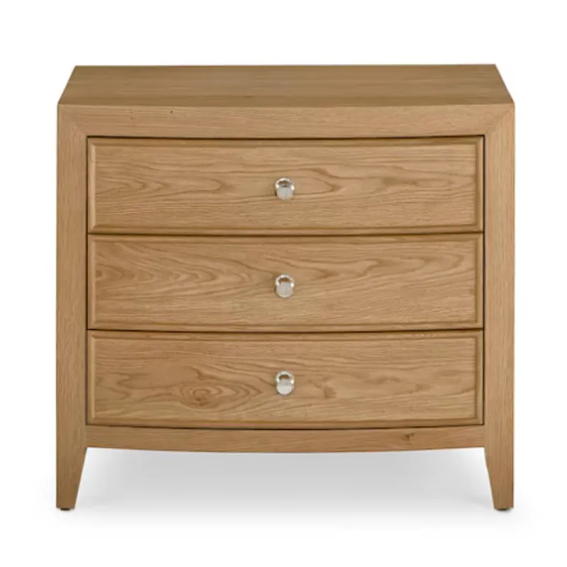 One of three night table options in the Newbury Collection, the Newbury Nightstand provides three drawers of closed storage for all your bedside essentials. With a top surface sized to allow for a lamp, books, eyeglasses, and more, we’ve designed this nightstand to play a strong supporting role in your most restful moments. It features the same framed side panels and polished nickel beehive knobs as the other pieces in the collection, allowing you to assemble a personally curated look for your bedroom. Offered in either textured White Oak or Parchment Gesso finishes.
