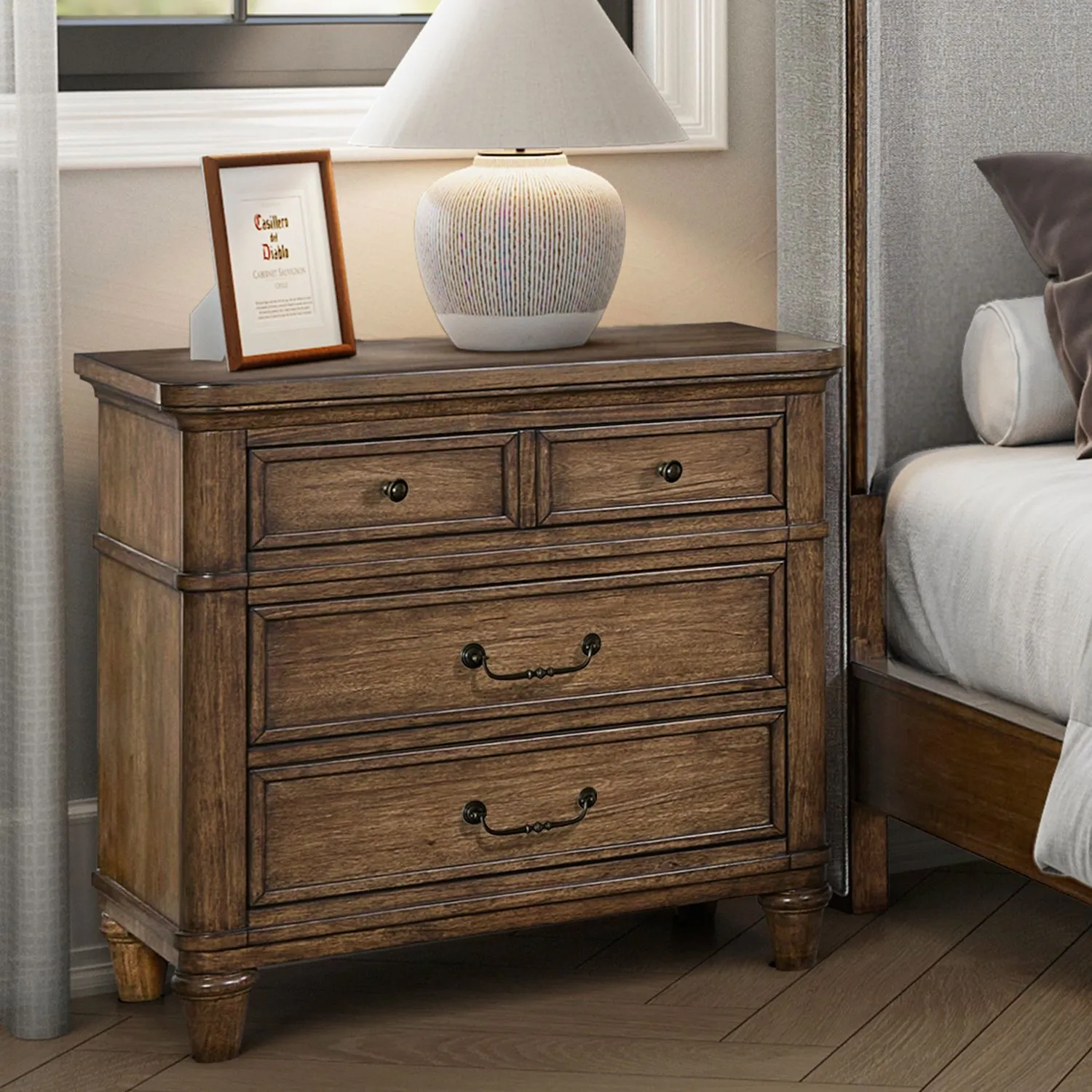 The Harrison Heights nightstand with charging station combines classic style with modern convenience. Crafted from Rubberwood solids and Rustic Birch veneers in a rich Sienna finish, this elegant 3-drawer nightstand features softly rounded pilasters flowing into turned feet. Square wood frame molding adds visual contrast to the case. The bluff cut top drawer, lined with premium felt, offers refined storage, while the bottom drawer features a cedar-lined panel for garment preservation. Stay connected with the built-in charging station, equipped with 2 AC outlets, 1 USB-A, and 1 USB-C port for effortless device charging.