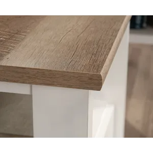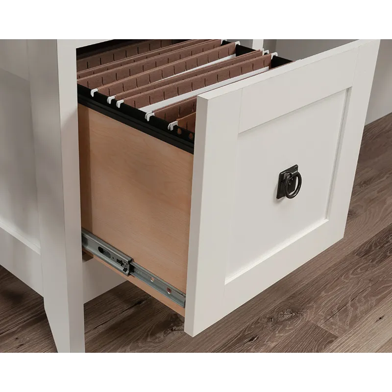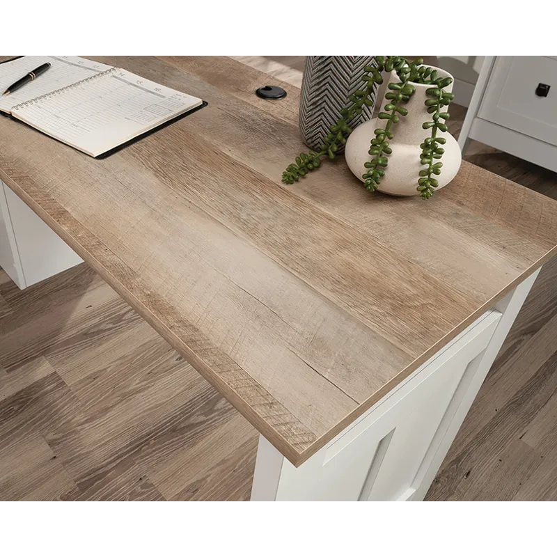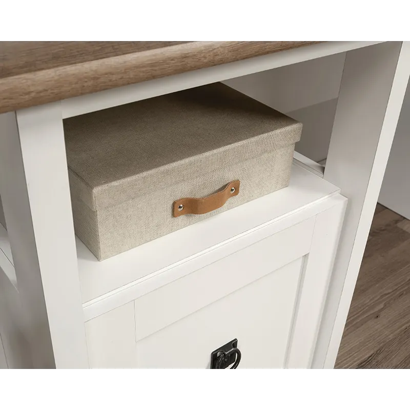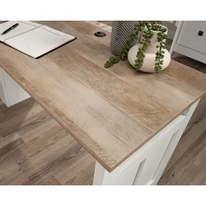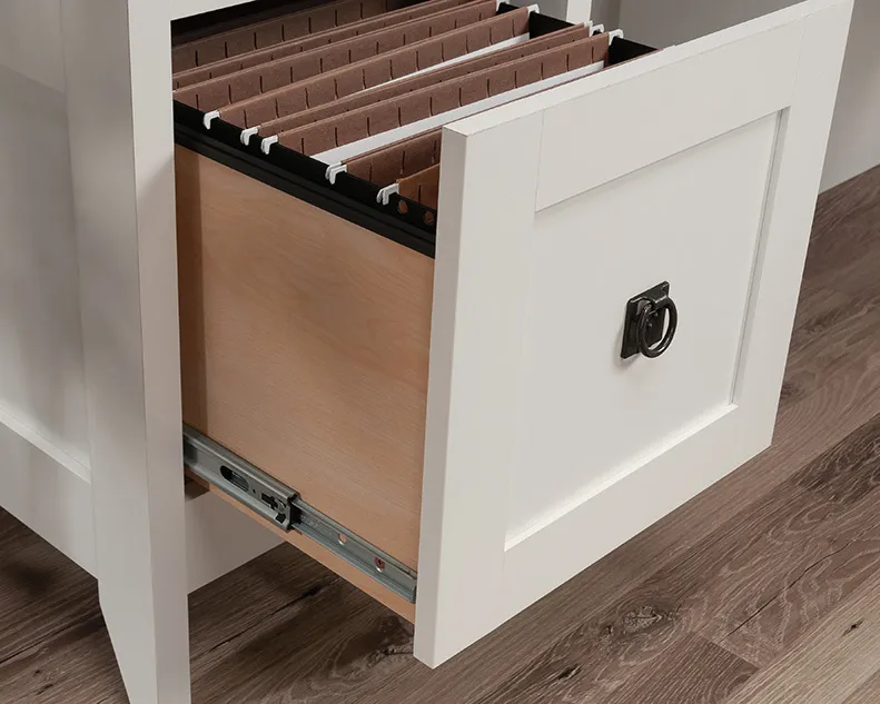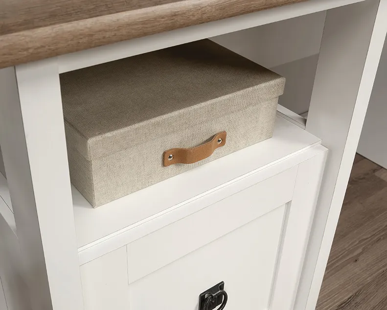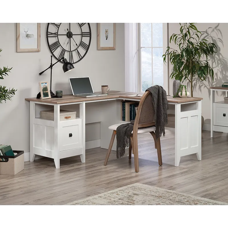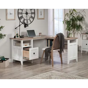 Bring the modern farmhouse look into your home with this L-shaped desk from the August Hill collection. This L-shaped home office desk features one file drawer with full extension slides that holds letter-size hanging files, keeping your important documents close at hand. Two desktop grommet holes and cord pass-throughs for cord management keep your farmhouse L-shaped desk tidy and free of cord clutter. A lower shelf for additional storage of your planner, books, pens, and more means that your office essentials are never far away. This L-shaped desk with drawer features quick and easy assembly with a T-lock drawer system. The top surface of this L-shaped desk with storage is spacious enough for your computer, a lamp, your cup of coffee, and your to-do list. This modern farmhouse desk is finished in Soft White® with the top surface accented in Lintel Oak®, making it a refined choice for any home office.