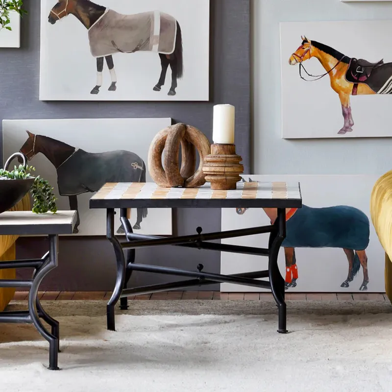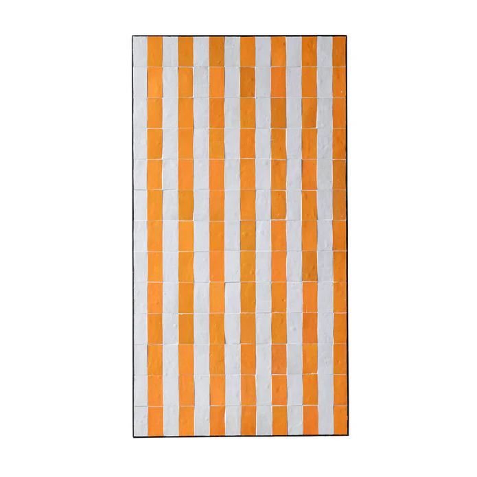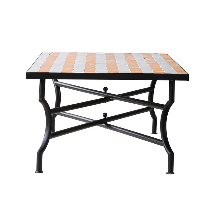 Crafted in Morocco's famed region for pottery, the centuries-old Zellige tile tradition is characterized by hand-fashioned and hand-glazed pieces. This coffee table highlights the artistry of hand-cut Zellige tiles in a bold striped pattern. Alternating bands of yellow and white tiles are meticulously arranged to create a striking design. The vibrant tile top rests on an iron base with graceful curved lines, blending traditional Moroccan craftsmanship with a modern aesthetic. Suitable for both indoor and outdoor use.