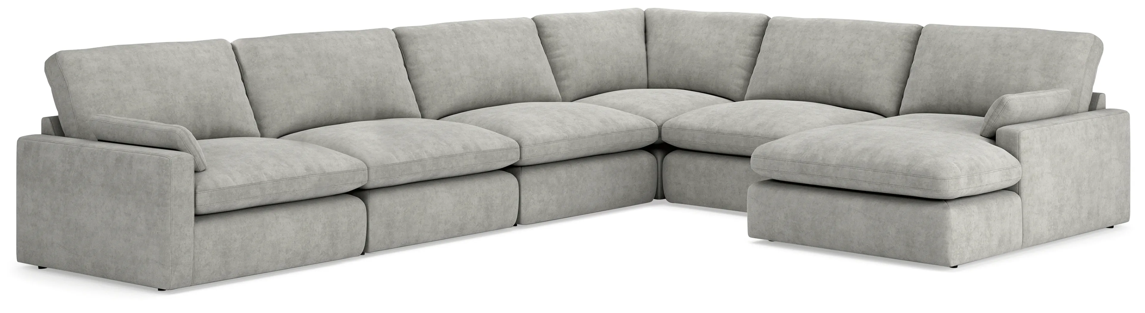 Includes 6 pieces: left-arm facing corner chair, right-arm facing corner chaise, wedge and 3 armless chairs