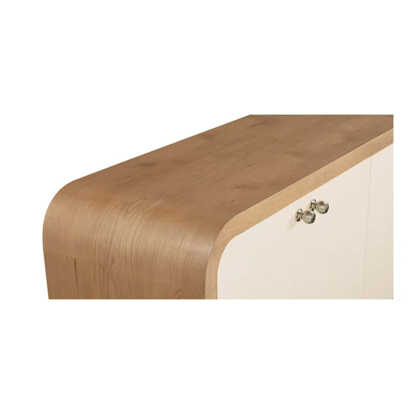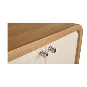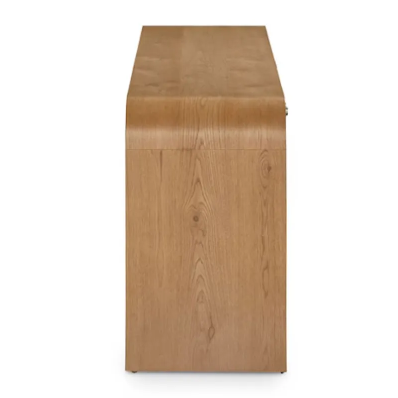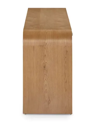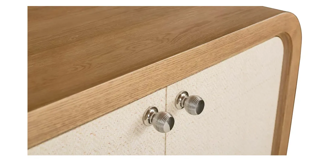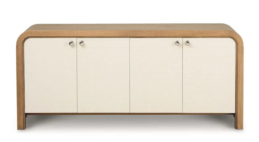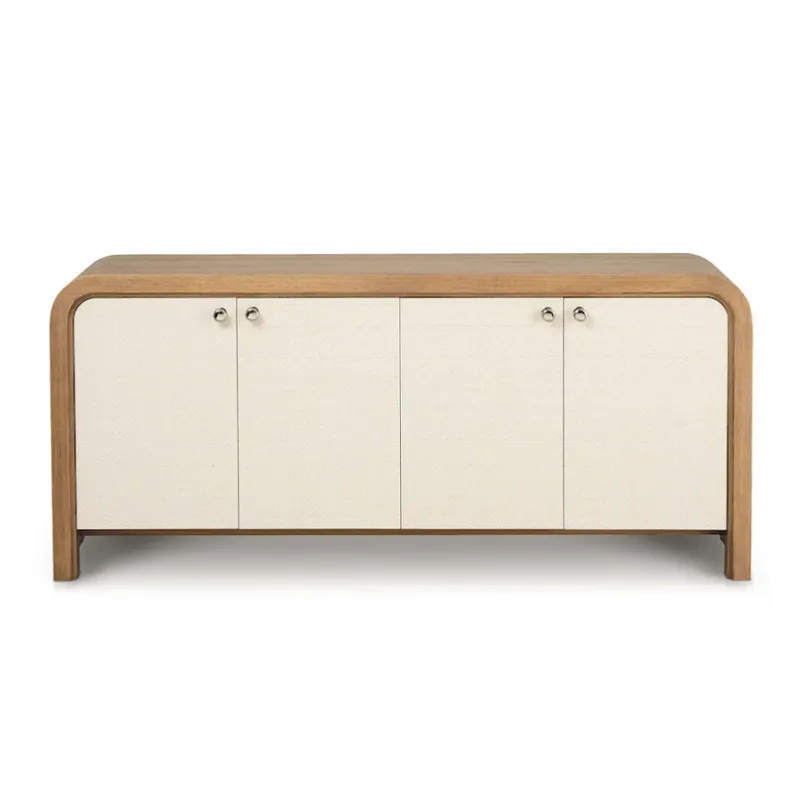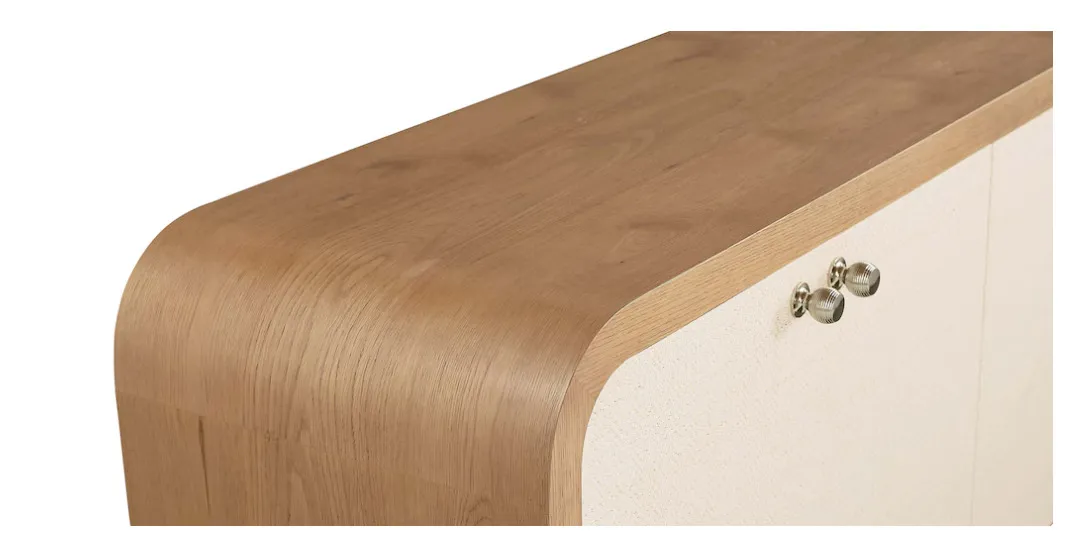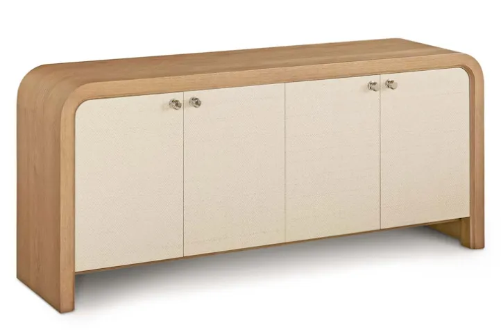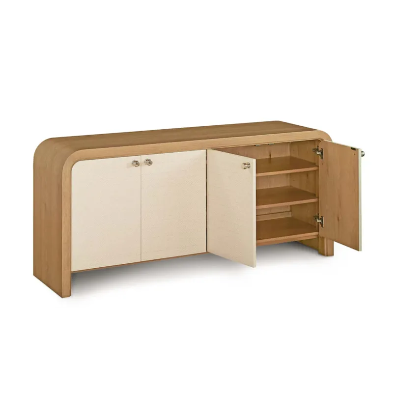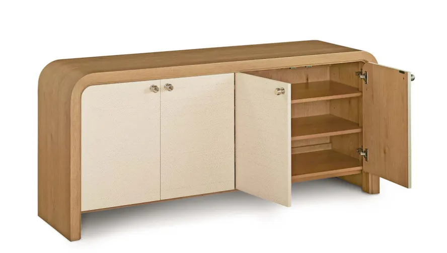 The Newbury 4 Door Arched Credenza is a classic example of how flexibly furnishing your home invites endless possibilities. This two-toned, curved edge credenza offers practical functionality for dining and living room settings while bringing a panache that will personalize your décor wherever it lands. The waterfall expanse of natural white oak frames two pairs of doors that open to adjustable shelves for well-ordered storage. The doors are finished in Newbury’s signature chevron pattern, creating both an artistic contrast and a stylistic link to all the other pieces in the collection. Wire management holes facilitate use in an entertainment setting.