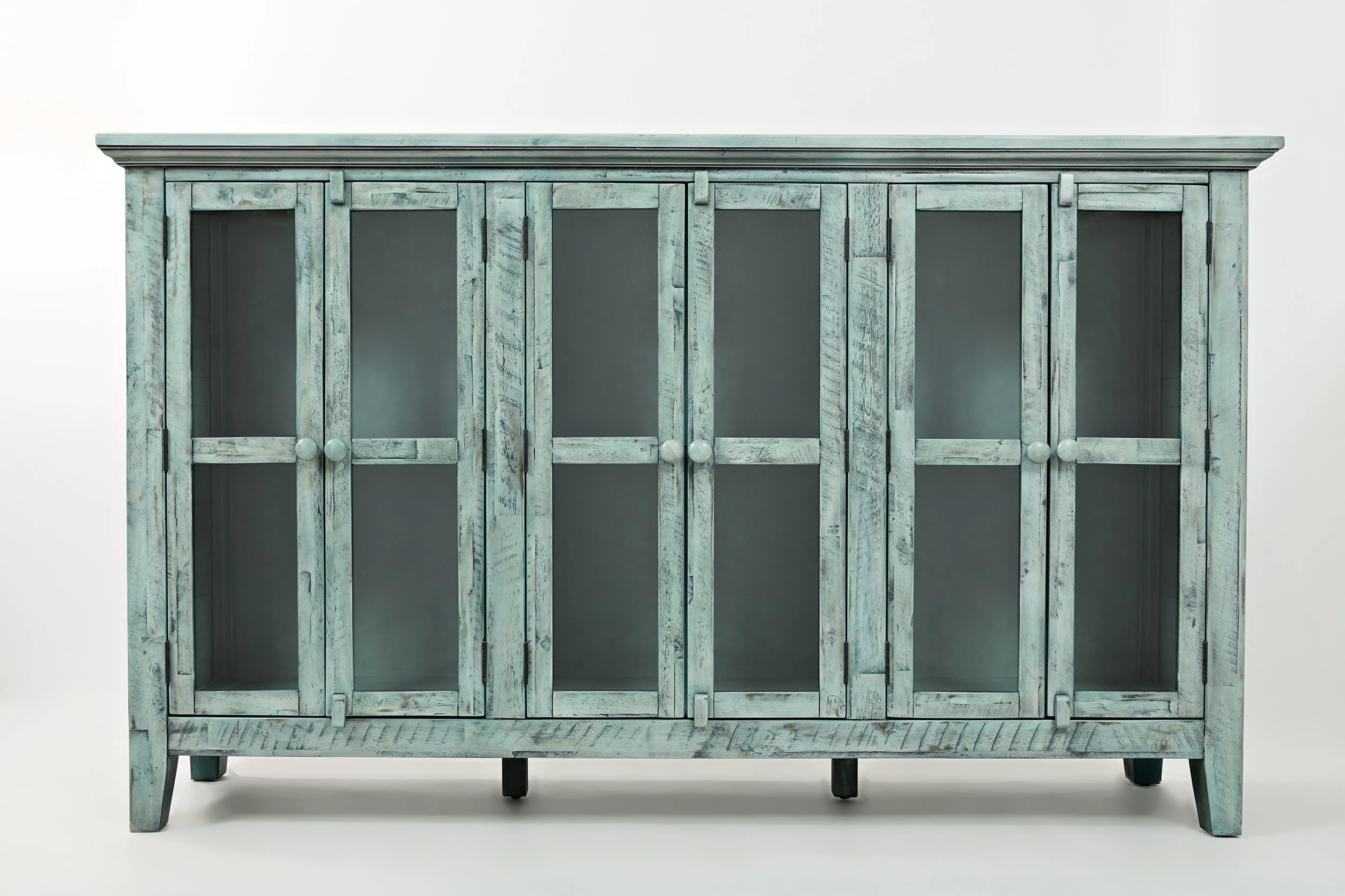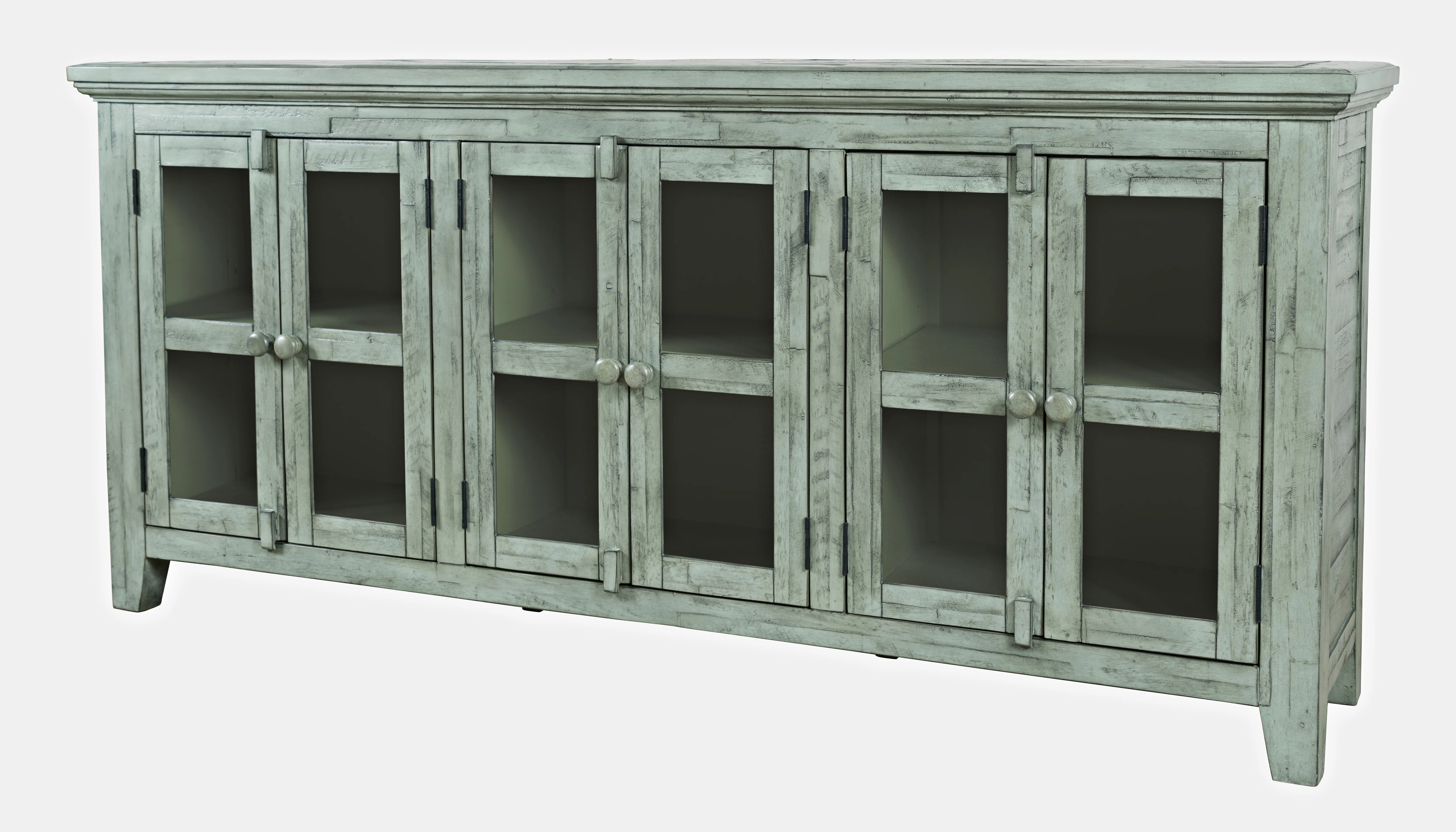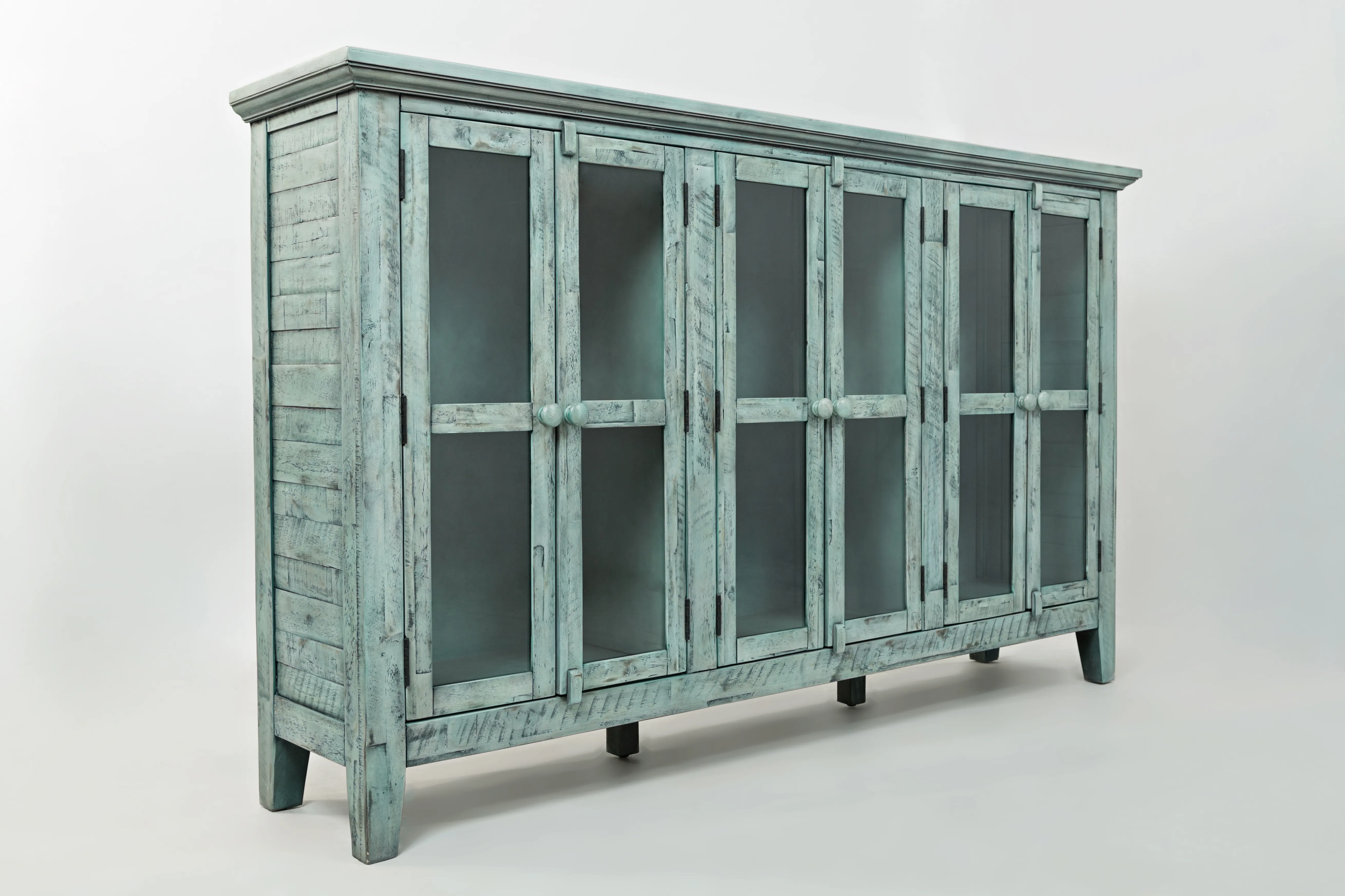 The relaxed coastal style of distressed hardwood Acacia provides the perfect rustic centerpiece for your home with this 70" Rustic Shores Accent Cabinet. The compact design has six doors with solid tempered glass and adjustable shelves, and the unique weathered finish is completely one-of-a-kind.